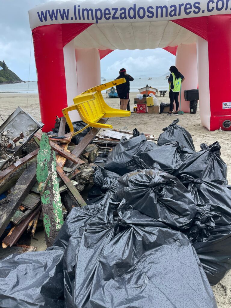 Os voluntários do projeto Limpeza dos Mares retiraram, no final de semana, 730 quilos de resíduos da praia do Pântano do Sul, em Florianópolis. Entre os itens coletados estavam madeiras trazidas pela maré, restos de construção, garrafas de vidro, bitucas de cigarro, resíduos de nylon, microplásticos, cadeiras velhas e muitos outros objetos que poluem e degradam o ambiente marinho. Foto: divulgação
