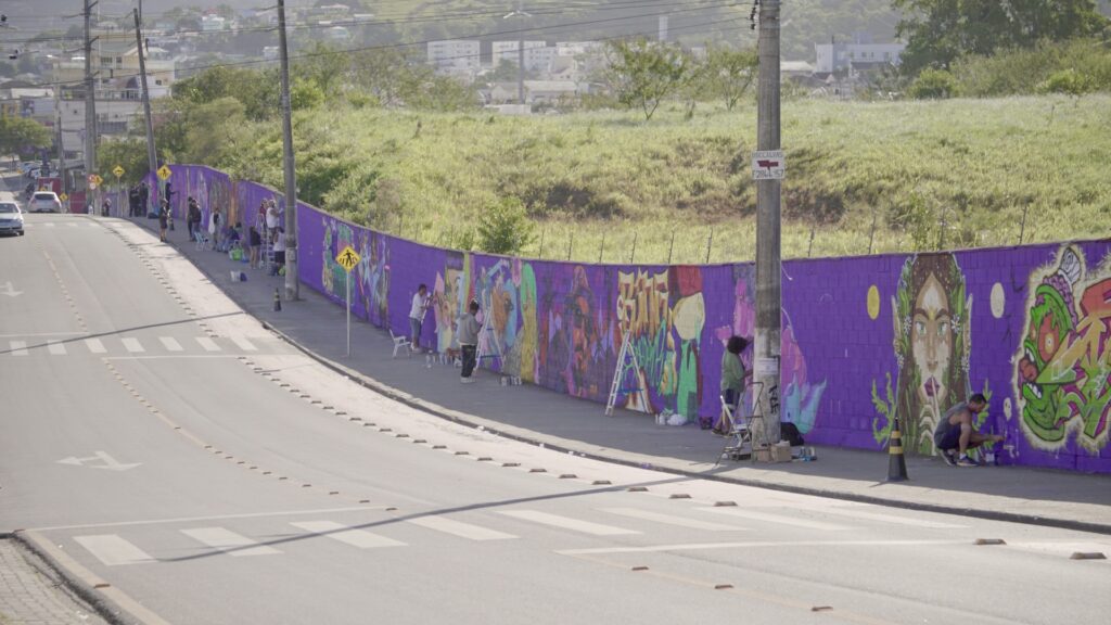 A subestação de energia de Palhoça, operada pela Eletrobras CGT Eletrosul, está transformada pela arte urbana. O muro externo do empreendimento deu lugar a um painel de 1.200 m², resultado de uma ação coletiva que reuniu 65 artistas de diferentes regiões do Brasil.