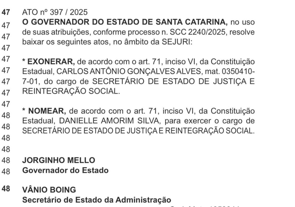 Santa Catarina tem, pela primeira vez, duas mulheres no comando da Secretaria de Estado de Justiça e Reintegração Social (SEJURI). Jorginho Mello nomeou Danielle Amorim Silva como nova secretária da pasta. A nomeação foi publicada no Diário Oficial do Estado (DOE) desta quarta-feira, 19. Joana Mahfuz Vicini segue como secretária-adjunta, consolidando uma gestão feminina e experiente à frente do sistema prisional e de reintegração social do estado.