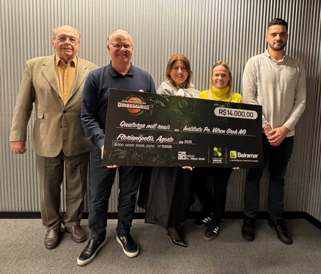 O Beiramar Shopping destinou R$ 14 mil ao Instituto Vilson Groh (IVG). O valor foi arrecadado durante o evento Mundo Perdido dos Dinossauros, no vão central. A iniciativa integra o Conexões Sociais, projeto criado pelo Beiramar para concentrar e potencializar ações de impacto com foco em crianças e jovens. Na foto, os integrantes do conselho do shopping, Antonio Scherer, Ronaldo Koerich e Tiago Bez, a superintendente Leila Martins, e a diretora do IVG, Adriana Laffin.
