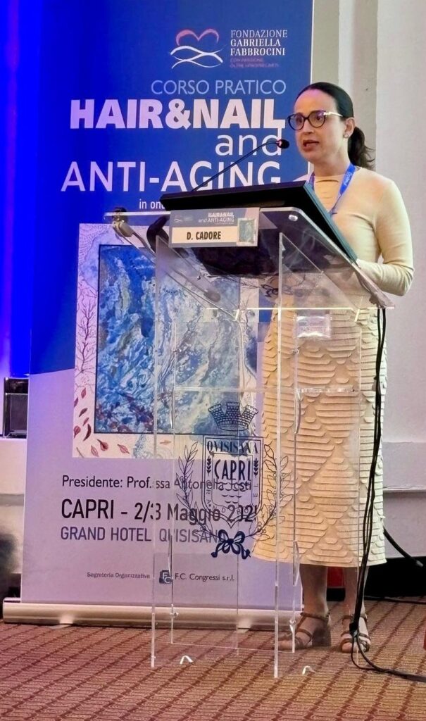 A médica dermatologista Débora Cadore foi convidada para palestrar no curso internacional “Hair, Nails & Anti-Aging”, ministrado em Capri (Itália) pela renomada professora Antonella Tosti. Ela compartilhou estudos sobre o uso de células-tronco derivadas da gordura nos tratamentos de rejuvenescimento cutâneo e alopecia. Segundo ela, que é pioneira no mundo ao utilizar células-tronco para tratar doenças capilares, “foi um cenário inspirador e científico de altíssimo nível”. Foto: divulgação