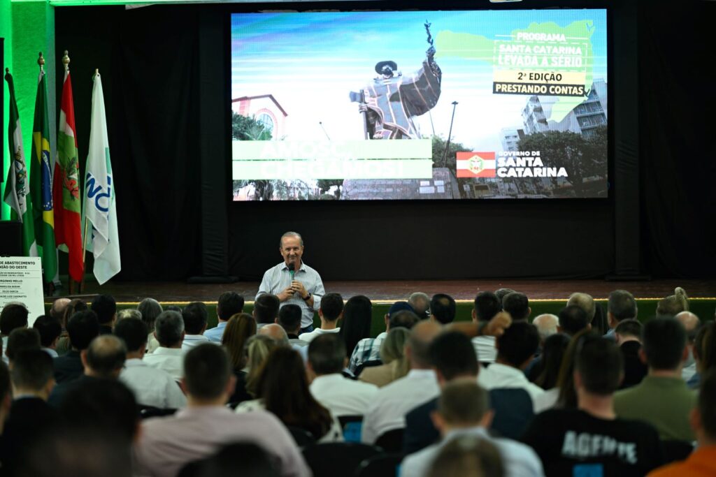 O governador Jorginho Mello apresentou em Chapecó nesta quinta-feira, 20, a 2ª edição do Programa Santa Catarina Levada a Sério – Prestando Contas. O encontro, realizado no auditório da Unoesc Chapecó, reuniu prefeitos, lideranças e representantes dos 20 municípios que compõem a Associação dos Municípios do Oeste de Santa Catarina (Amosc). Durante o evento, o governador anunciou novos investimentos para a região, reforçando o compromisso do Estado com o desenvolvimento do Oeste catarinense.