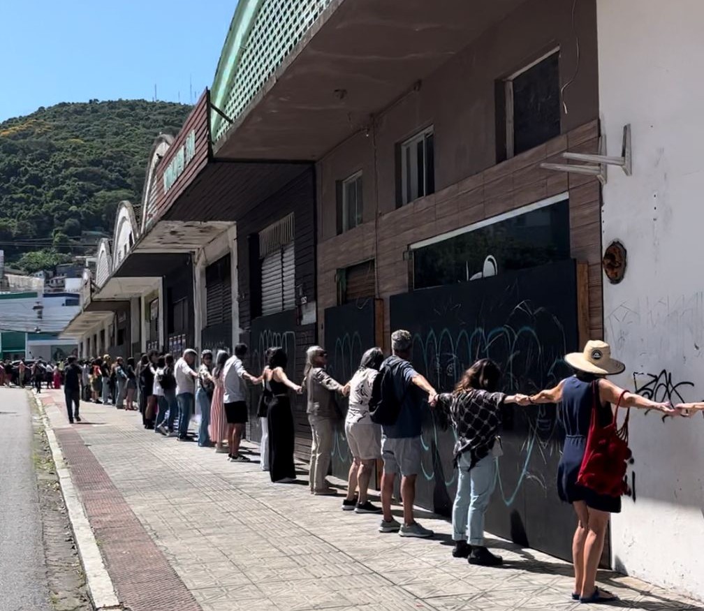 O Movimento Traços Urbanos liderou, no sábado (5), um abraço coletivo à antiga rodoviária de Florianópolis. O objetivo foi marcar posição contra o leilão do imóvel, previsto em projeto encaminhado pela prefeitura à Câmara de Vereadores, e defender a recuperação e transformação do imóvel, com uso público do espaço. O grupo lançou uma petição pública. Foto: divulgação