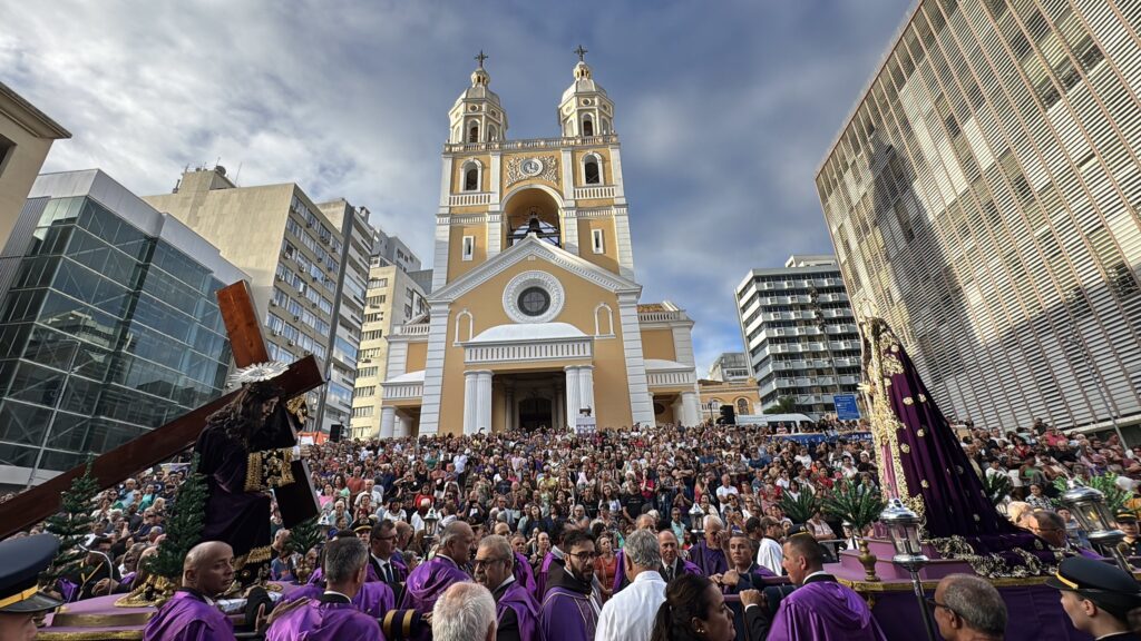 A Procissão do Senhor dos Passos, reconhecida como patrimônio cultural imaterial de Santa Catarina, tomou as ruas do centro de Florianópolis no fim de semana. O ponto alto foi o Sermão do Encontro, realizado por Dom Onécimo Alberton, bispo auxiliar da Arquidiocese de Florianópolis. Ele destacou o poder transformador do amor materno. “O afeto da mãe nos dá forças para suportar a dor. É no colo da Mãe que encontramos alívio, consolo e resiliência. O amor é capaz de transformar feridas em cura e sofrimento em esperança”, afirmou. Foto: Leonardo Sousa, divulgação