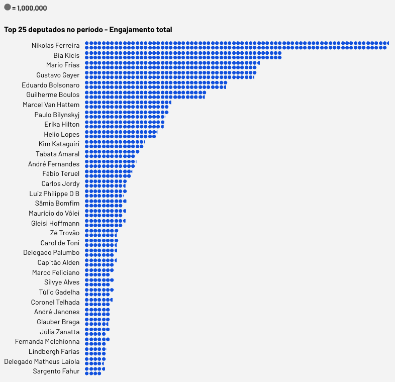 Mas talvez o dado mais eloquente de todos seja outro: os 35 deputados com maior engajamento em seus posts concentram mais de 60% de todas as interações registradas no Instagram ao longo de um ano. Isso revela um Congresso digitalmente assimétrico, onde a maior parte dos parlamentares disputa o que sobra da atenção pública — muitas vezes com conteúdos genéricos, prestações de conta neutras, agendas pouco narradas. As equipes produzem mais, mas não conseguem furar o ruído. A diferença entre o topo da cadeia e o restante é brutal. E, em boa medida, estrutural.