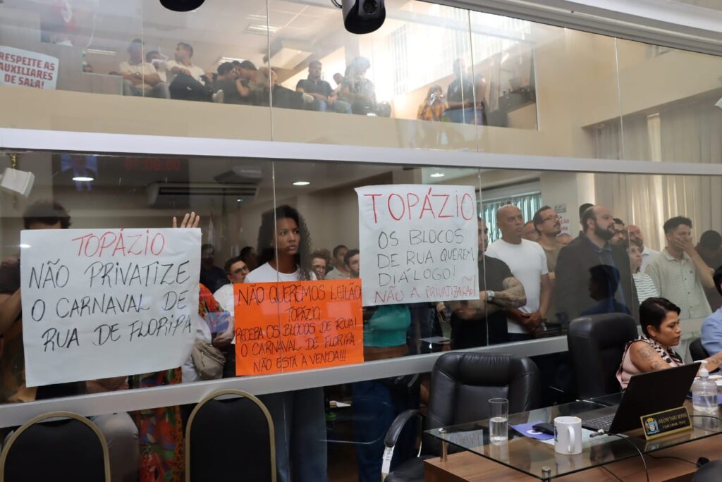 A primeira sessão do ano na Câmara da capital foi marcada por protestos de servidores – que pediam a revogação da portaria que trata sobre os professores de educação especial – e de representantes de blocos de Carnaval, contrários ao edital de leilão lançado pela prefeitura.
