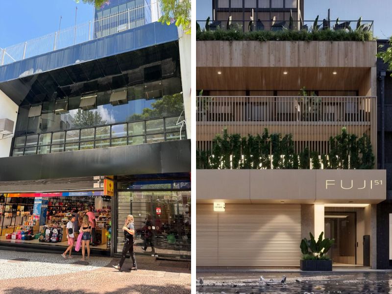 No alto, o antes e o depois do Soho, na avenida Rio Branco, obra de Retrofit já concluída pela Reviva. Fotos: divulgação
