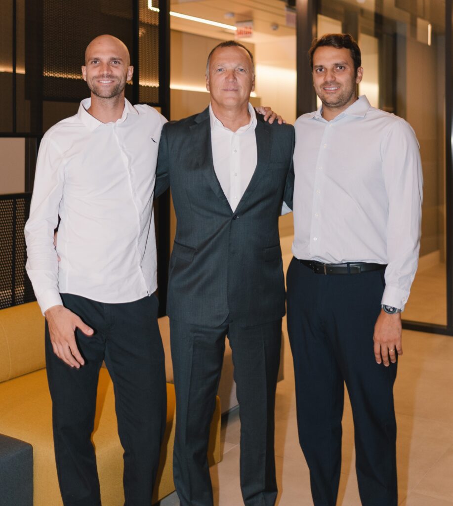 Foi inaugurado no último dia 18 o First, arrojado residencial multifuncional na SC-401,em Florianópolis. Acima, Celso, proprietário da Furtado de Mendonça Empreendimentos, entre os filhos Vitor, diretor de marketing, e Bernardo, diretor financeiro. Foto: Alessandra Chastalo, divulgação
